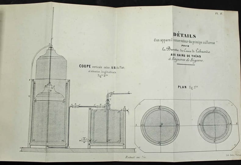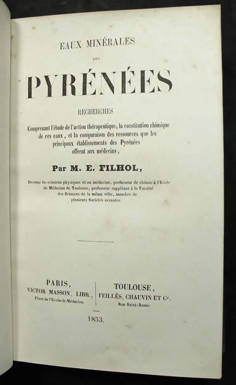 ÉDITION ORIGINALE. Elle est illustrée de 7 tableaux dépliants et de 3 planches dépliantes (plan général des thermes de Luchon, détails d'un appareil conservateur du principe sulfureux utilisé à Bagnères de Bigorre et appareil aspirateur employé pour analyser l'air des piscines, salles de douches, etc.). Édouard FILHOL (1814-1883) était chimiste et devint professeur à l'école de médecine de sa ville. Il pratiqua aussi la minéralogie, l'hydrologie, l'étude des cavernes et fut un des premiers défenseurs de "l'Homme fossile". Maire de Toulouse, il créa le Muséum d'histoire naturelle (1865) dont Noulet souhaitait la création depuis 1831. (Dendaletche, 734 - Labarère, 572). BON EXEMPLAIRE en reliure d'époque, complet des planches et tableaux dépliants. GOOD COPY. PICTURES AND MORE DETAILS ON REQUEST.