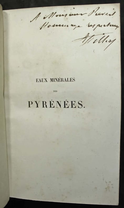 Première édition. Illustré par 7 tableaux et 3 planches dépliants hors-texte représentant des données scientifiques et des coupes d'appareils ainsi qu'un plan général des thermes de Luchon. Envoi manuscrit de l'auteur : "A Monsieur Preveil (ou Reveil?) Hommage respectueux". Bel exemplaire. Dendaletche, Pyrénées, Guide bibliographique illustré 735. /// In-12 de XVI, 540 pp., 7 tableaux et 3 planches dépliants hors-texte. Plein chagrin brun, dos à nerfs. (Reliure de l'époque.) ////