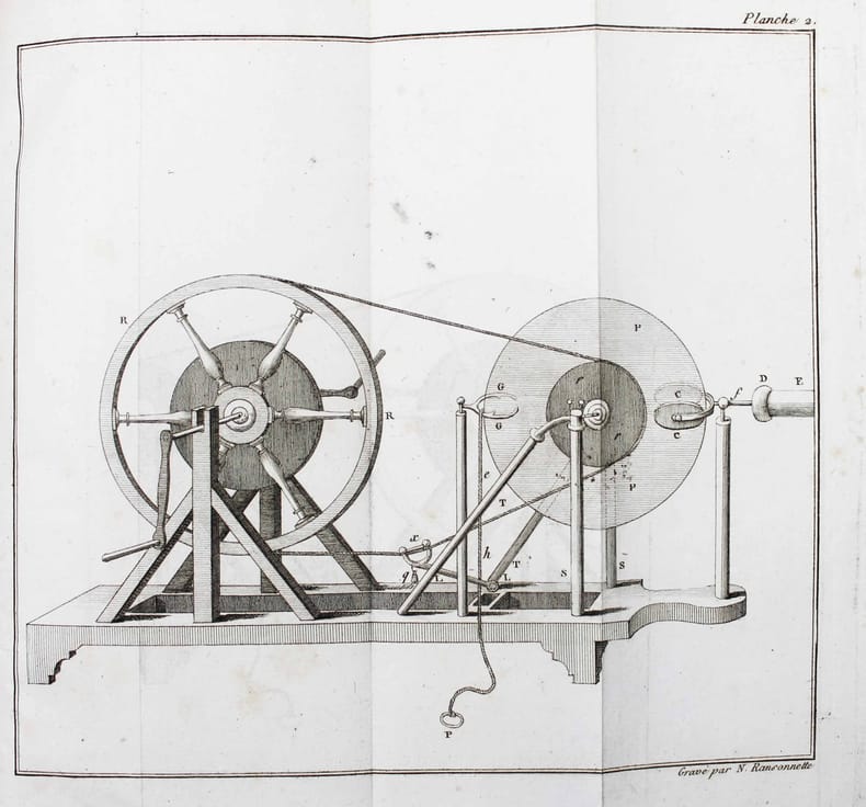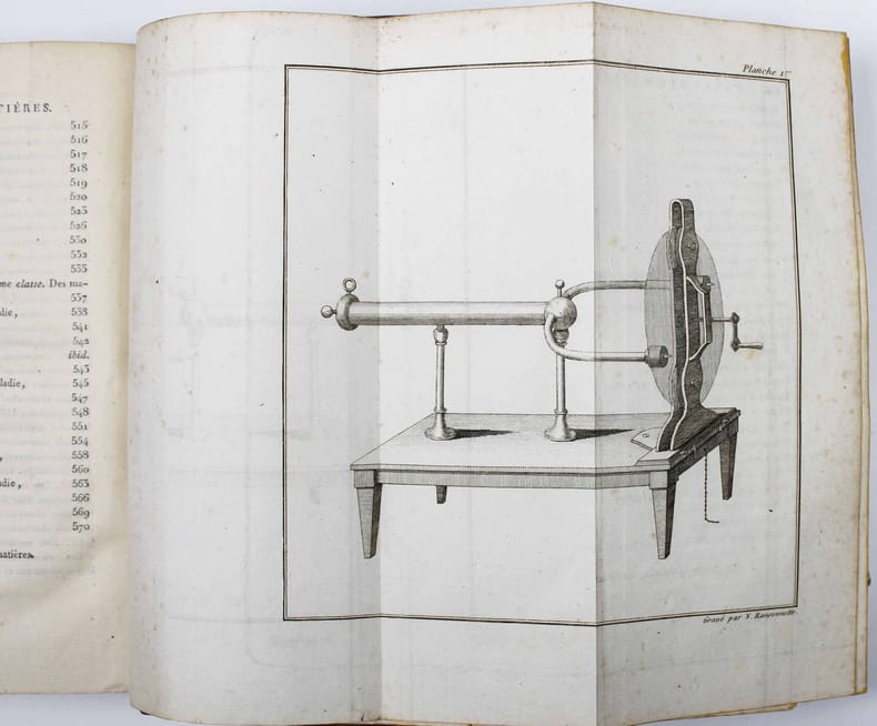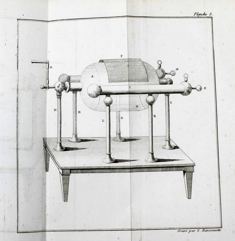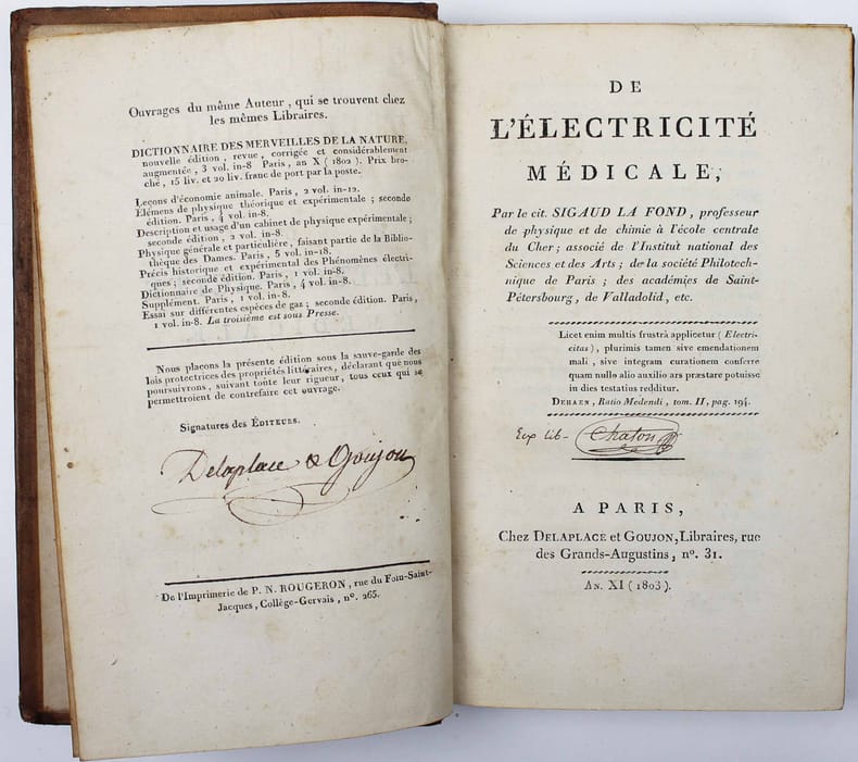 Edition originale. C'est le dernier ouvrage de Sigaud de Lafond, élève de l'abbé Nolet. Illustrée par 4 planches dépliantes hors-texte montrant des instruments et des machines électrostatiques. Ex-libris manuscrit de l'époque sur le titre : "Chaton". Petites restaurations à la reliure, dorure du dos terni, petit travail de vers dans la marge extérieure. In-8, [202 x 118 mm] de (4), XXXII, 586 pp., 4 planches. Veau brun, dos orné. (Reliure de l'époque.) - - - - - - - - - - - - - - - - - - - - First edition. The last work by Sigaud de Lafond, a pupil of Abbé Nolet. Illustrated with 4 folding plates out of text showing electrostatic instruments and machines. Handwritten contemporary bookplate on title: Chaton. Minor restorations to binding, gilt on spine tarnished, small worm work in outer margin. -