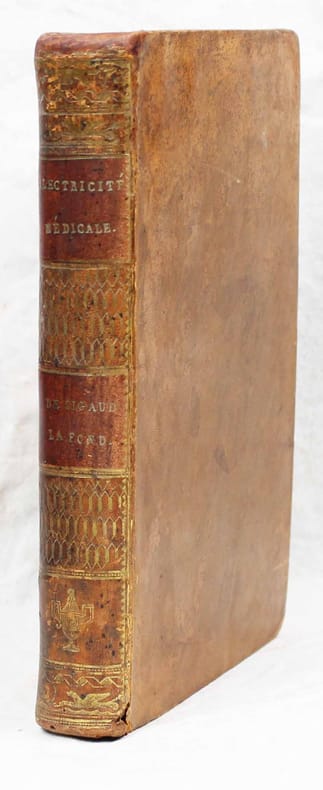 Paris, Germer Baillière, 1872, in-8, VIII, 802pp, demi-chagrin bleu marine de l'époque, dos à 4 nerfs avec fleurons, titre et nom de l'auteur en lettres dorées, tranches mouchetées, signet (coiffes, coupes et coins abîmés, accidents au dos et plats frottés), Première publication en volumes des "mémoires" d'Onimus et Legros sur l'électricité médicale parus précédemment dans le "Journal d'anatomie et de physiologie", amendés et complétés pour la présente publication. Soucieux de constituer une nouvelle science fiable, l'électricité médicale, ils basent leurs travaux "uniquement sur des lois découvertes expérimentalement". Leur démarche est essentiellement physiologique. Ils examinent et identifient les modifications que l'électricité opère sur les diverses régions du corps pour l'appliquer à des cas cliniques particuliers. 144 figures dans le texte en noir VIII, 802pp.