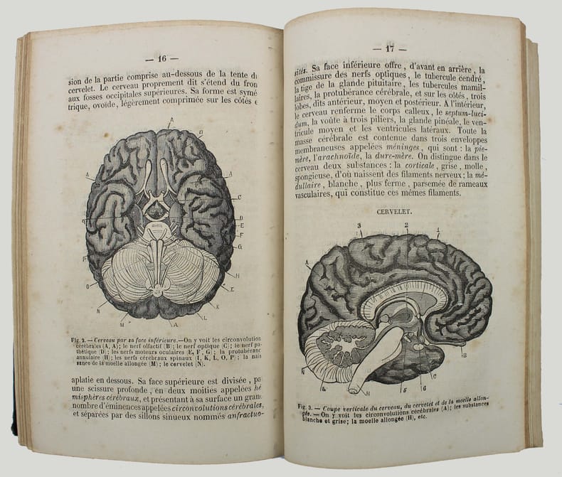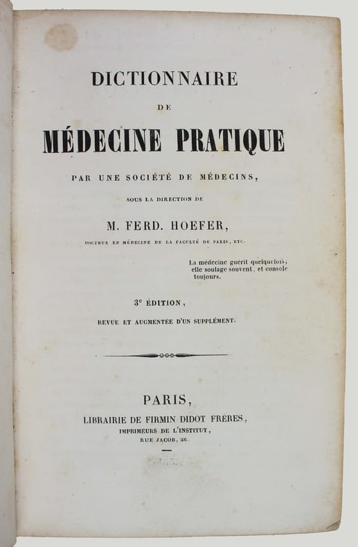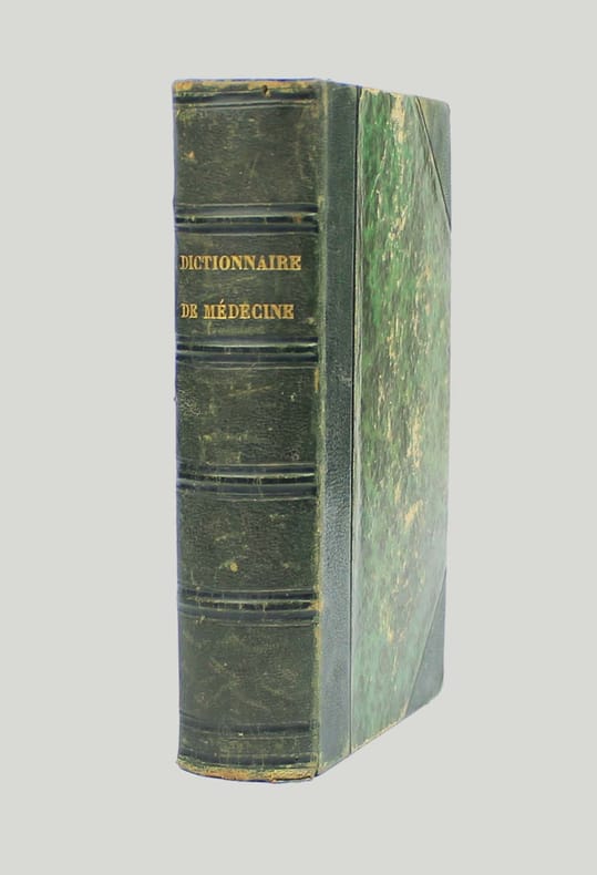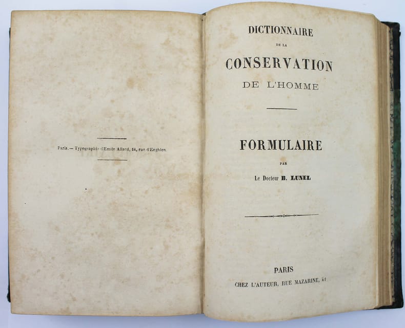 Troisième édition, revue et augmentée d'un supplément. Relié à la suite : - LUNEL B. Dictionnaire de la conservation de l'homme. Formulaire. Paris, chez l'auteur. (4), 151 pp. - Dictionnaire de la conservation de l'homme. Atlas élémentaire d'anatomie avec texte explicatif. - Paris, chez l'auteur. (4), 86 pp., 61 figures dans le texte. Des rousseurs. /// In-12 de (4), II, 533 pp. Demi-basane verte à coins, dos à nerfs. (Reliure de l'époque.) ////