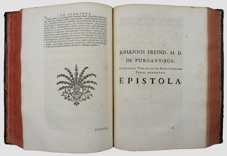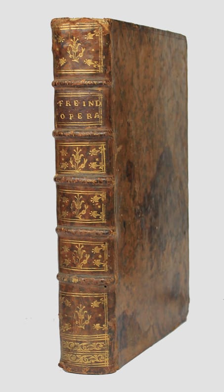 First edition printed in Paris. "Opera omnia medica" contains all Freinds major scientific and medical writings: Praelectiones chymicae; Emmenologia, in qua fluxus mulieeibus menstrui phaenomena...ad rationes mechanicas exiguntur; Freinds revised version, with extensive commentary, of Hippocratis de morbis popularibus liber primus et tertius: J. F. de purgantibus in secunda variolarum confluentium febre adhibendis, epistola; J. F. ad R. Mead de quisbusdam variolarum generibus epistola; Oratio anniversaria ex Harvaio instituto, delivered to the College of Physicians in 1720; and Historia medicinae, a latin trans by John Wigan of The History of Physick; From the Time of Galen to the Beginning of the Sixteenth Century. Minor signs of wear, fairly good copy. /// In-4 de LVI, 232, 388, (4) pp. Veau marbré, dos à nerfs orné, tranches rouges. (Reliure de l'époque.) ////