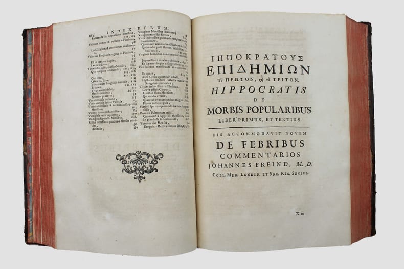 Ferguson I, 291. - Blake 161. - Graesse II, 632. - Vgl. HOH 781 (für die Londoner Ausgabe 1733). - Pariser Nachdruck der ersten lateinischen Werkausgabe der Schriften, herausgegeben von John Wigan mit dem Abdruck seiner "History of physick" im zweiten Teil, dem ersten historischen Abriss der Medizingeschichte eines Engländers. - Stellenweise mit Wasserrand. Titel mit handschriftlichen Besitzvermerken. Zwei Blätter mit Eckausriss bzw. mit Einriss. Einband an den äusseren Rückenkanten angebrochen. Kapitale ausgerissen. Ecken bestossen.