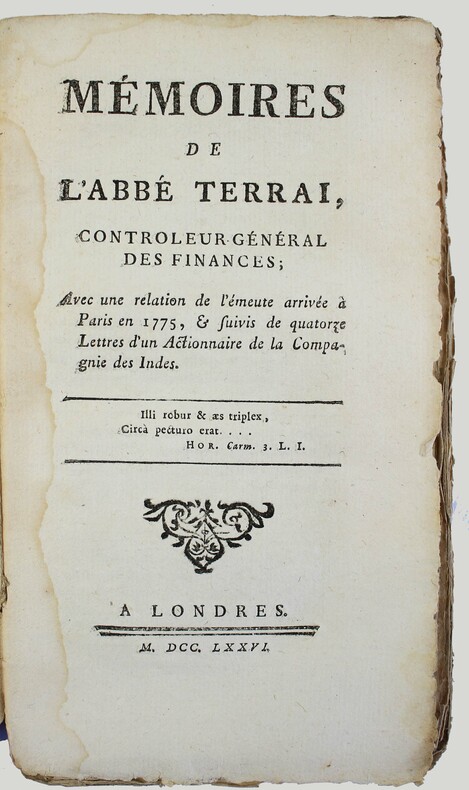 Une des trois éditions publiées l'année de l'originale, la première selon Einaudi. Les Mémoires apocryphes de l'abbé Terray, sont suivies de la relation de l'émeute populaire provoquée par la "cherté du pain", survenue à Paris le 3 mai 1775 et des 14 lettres d'un "actionnaire de la Compagnie des Indes". Importante source pour l'histoire économique de la période.(Einaudi, 1290. INED, 1195. Kress, 7204. Stourm, p. 85).Mors fendillés, accrocs de cuir à la reliure qui demeure solide. Très bon était intérieur.