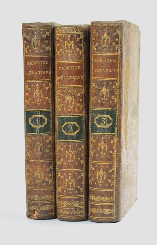 Un des grands chirurgiens de son époque, Raphael Bienvenu Sabatier (1732-1811) occupa la chaire de médecine opératoire à la Faculté de Paris et a été nommé chirurgien-consultant de Napoléon. Défauts d'usage aux reliures. Exemplaire complet. /// 3 volumes in-12 de (4), XLII, (2), 384 pp./ XXXVI, 420 pp. / (4), XXIV, 425 pp. Basane marbrée, dos orné, tranches rouges. (Reliure de l'époque.) ////