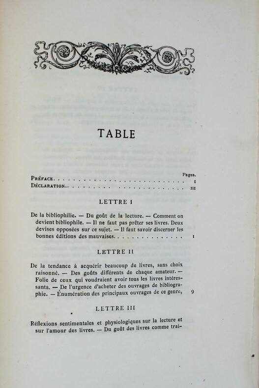 Édition originale ornée de 2 vignettes d'Alfred Gérardin gravées à l'eau-forte. Sous forme épistolaire, l'auteur aborde l'urgence d'acheter des ouvrages de bibliographies, le goût des livres comme traitement des maladies de l'âme, la variation du prix des livres et de la mode en bibliophilie, la vanité chez les bibliophiles, les idées bizarres des femmes sur le goût des livres, et de nombreuses éditions en particulier. Dos passé et frotté, petit manque en coiffe de tête.