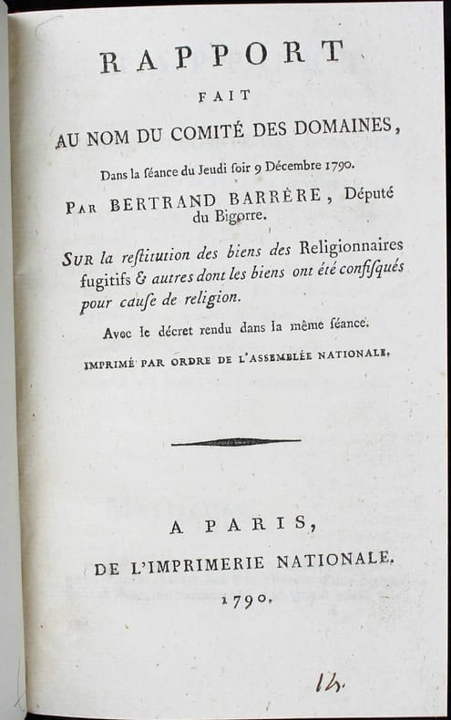 Relié à la suite du même : Rapport fait au nom du comité des domaines, sur la régie & l'administration des biens des religionnaires fugitifs, pendant les trois années portées par l'article XX du décret du 9 décembre 1790, qui en ordonne la restitution, et la vente après ce délai. Paris, Impr. Nationale, 1791. 12 pp. /// In-8 de 27, (1) pp. Cartonnage moderne. ////