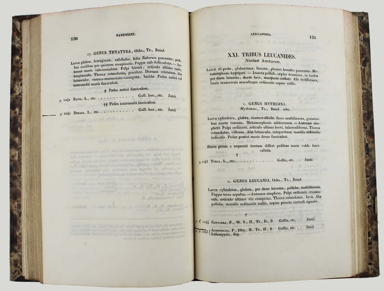 Volume faisant partie des "Suites à Buffon" publiées par Roret. Trace d'humidité dans la partie supérieure de l'ouvrage. On trouve relié à la suite un MANUSCRIT de 60 pages : "Lépidoptères. Catalogue. 1839. (Extrait de l'ouvrage publié par M. Duponchel sur les lépidoptères de France.)" /// In-8 de VII, (3), 238 pp. Demi-basane noire, tranches mouchetées. (Reliure de l'époque.) ////