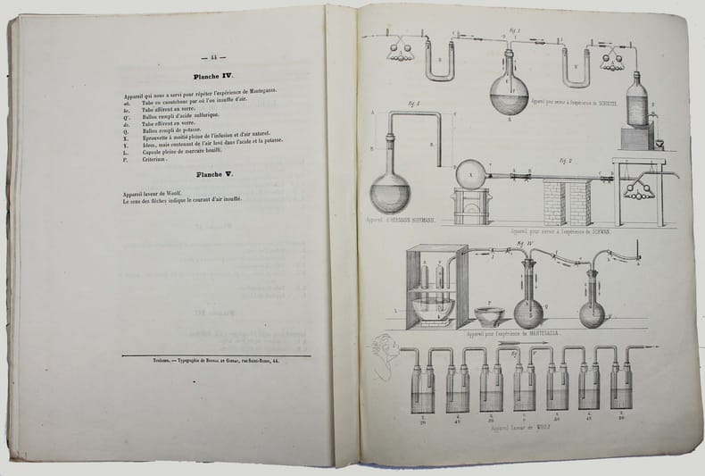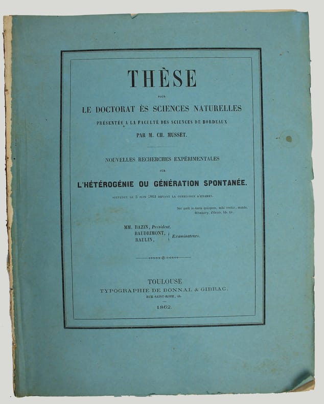 Thèse pour le doctorat es sciences naturelles présentée à la Faculté des Sciences de Bordeaux; elle est dédiée à Pouchet et Joly et réfute les travaux de Pasteur. Envoi de l'auteur sur la page de titre : "A M. A. Cabena (?) Hommage et très sincères amitiés. Ch. Musset". /// In-4 de 44 pp., 1 planche. Broché, couvertures imprimés, détaché d'un recueil. //// /// PLUS DE PHOTOS SUR WWW.LATUDE.NET