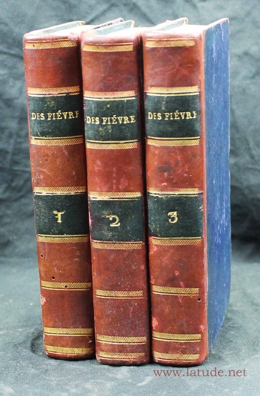 Le tome III a pour titre: - Essai sur la fièvre pestilentielle de Sydenham, communément appelée fièvre de camp, de vaisseau, d'hôpital et de prison. 250 pp. - Réflexions sur la nature des fièvres. pp. 251 à 354. Bel exemplaire. /// 3 volumes in-12 de XLVIII, 387 pp. / (2), 416 pp. / XX, 388 pp. Demi-basane brune, dos orné, étiquettes de titre et de tomaison noires, tranches mouchetées. (Relié vers 1800.) ////