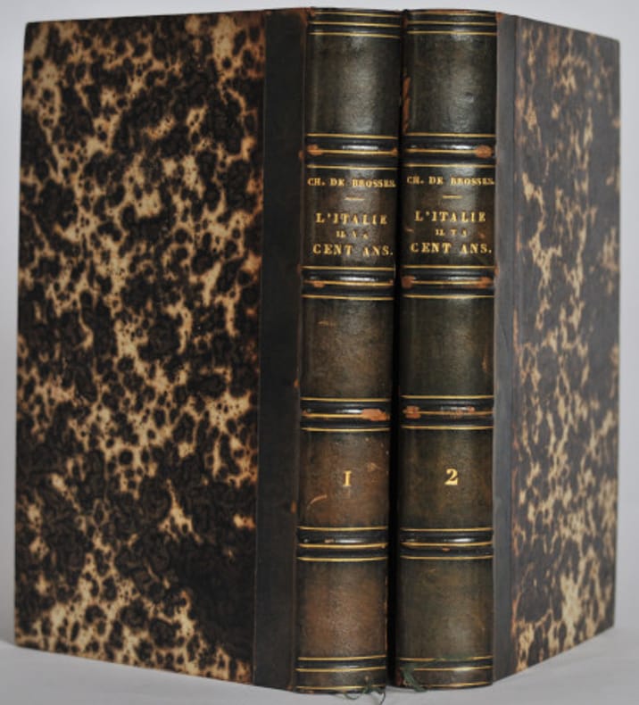 Paris, Levavasseur, Paris, Levavasseur1836 ; 2 vol. in-8, demi-veau outremer glacé , fil. dor., tranches jasp., XXVIII pp., 434 pp., 1f. errata.- 2 ff., 507 pp., ( 1 p. errata).ÉDITION ORIGINALE COMPLÈTE, donnant le texte intégral des lettres. Elle fut établie par R. Colomb, cousin et ami de Stendhal. Edition très recherchée, car la première en trois volumes publiée sous le Directoire par Seryès d’après une mauvaise copie trouvée dans les papiers d’un émigré est extrêmement fautive. Ami de Buffon, de Crébillon, lié aux encyclopédistes, le Président de Brosses ( Dijon 1709-1777) fut un de ces hommes « qui, presque par système, vivent pleinement par leur esprit et leur corps » J.P. de Beaumarchais. Ses Lettres sur l’Italie, fruit d’un vrai coup de foudre pour cette terre de plaisir et de culture, , demeurent « un chef d’œuvre d’humour et de drôlerie. L’Italie de notre Président est un monde à l’envers où les amants sont plus jaloux que les époux, où les jeunes filles soutiennent un débat en latin, où les courtisanes veulent être aimées » Id.- « Le Voltaire des voyageurs en Italie ! » dira Stendhal. Charles de Brosses est un compagnon de voyage unique, toujours gai, gourmand, curieux et qui a le sens des formules. Celle-ci est célèbre, mais on a oublié qu’il en était l’auteur : « à vous parler net, la Provence n’est qu’une gueuse parfumée » ( tome I, p. 38). Envoi autographe de l’éditeur Romain COLOMB à Casimir Leconte (écrivain, traducteur et économiste auquel on doit divers ouvrages sur la Suède, la Grèce et l’Orient). Romain Colomb fut le véritable artisan de la gloire posthume de Stendhal. On lui doit la réédition de ses œuvres chez Hetzel et chez Michel Lévy. Il a veillé à ce que ses manuscrits inachevés ne fussent pas détruits, comme leur dépositaire Crozet avait l’intention de le faire. En tête du premier tome on a relié un portrait de Ch. de Brosses.
