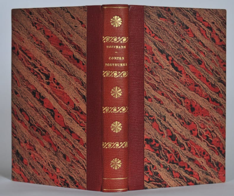 Paris, Michel Lévy, , Paris, Michel Lévy, 1856 ; In-12, demi-chagrin rouge à grains longs, dos lisse orné, couverture (plats et dos) conservée, tête dorée. (2)ff., III pp., 323 pp.EDITION ORIGINALE. Six contes de Hoffmann: Les suites d’une queue de cochon – Histoire de l’Irlandais Ewson – Dernières aventures d’un aventurier – Haimatochare – Lettre du maître de chapelle Jean Kreisler – Les Méprises – La Fenêtre du coin du cousin. En fin de volume une mélodie (paroles et musique notée) de Hoffmann extraite des Six duos italiens pour soprano et ténor. La première partie du livre contient d’importantes études sur Hoffmannpar Champfleury: De l’introduction des contes d’Hoffmann en France – Essai sur les œuvres d’Hoffmann. Suivent différents témoignages et documents sur Hoffmann: Vie d’Hoffmann par Rochlitz – Quelques traits par son ami Funck – Les portraits d’Hoffmann, ses dessins – 4 chapitres sur Hoffmann musicien et sa correspondance musicale – Extraits de sa correspondance. Agréable exemplaire. Quelques rousseurs.