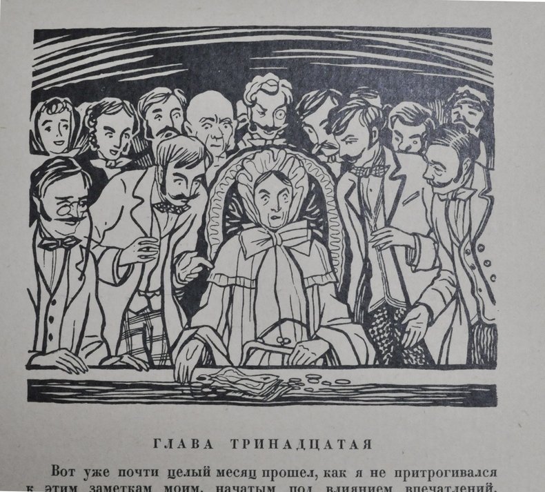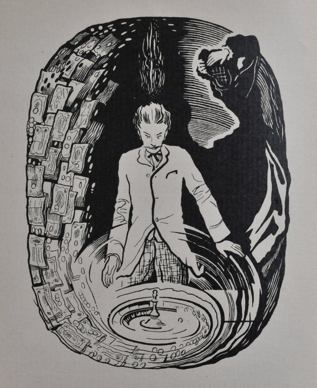 [Lénigrad, Maison des Écrivains], [Lénigrad, Maison des Écrivains]1930 ; in-4, broché, couverture illustrée. 164 pp., 2 ff. de catal. de l’éditeur - illustrations en noir dans le texte.Belle édition du Joueur illustrée de bois de Nicolaï Vasilievich Alexeev (Moshansk 1894 - Léningrad 1934). L’illustration comporte la couverture, frontispice à pleine page, titre orné, 17 bandeaux, 17 culs-de-lampe et 12 planches à pleine page.Dos cassé, intérieur frais, non coupé.