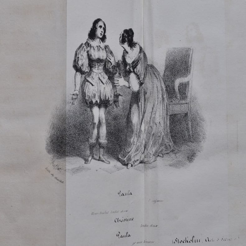 "Édition originale, ornée d'une lithographie dépliante de Charlet d'après Raffet. La première de Christine, le 30 mars 1830 au théâtre de l'Odéon, fut comme la deuxième manche de la fameuse, et alors toute récente -la pièce de Dumas faillit d'ailleurs être représentée avant celle de Hugo-, ""bataille d'Hernani""… La contre-attaque fomentée par les classiques y fut balayée par l'intervention de Frédéric Soulié qui en renfort du cénacle romantique évidemment au complet, mobilisa pas moins de cinquante ouvriers de sa scierie. Cette scène digne des Enfants du paradis est décrite par Daniel Zimmermann dans sa biographie de Dumas: ""- Canailles! - Perruques! - Imbéciles! - Perruquiers! -Ils ne comprennent pas! - Les précieuses à l'hôtel de Rambouillet! (…) Sur un signe de leur patron, les cinquante prolos s'affairent au parterre, ravis de ces heures supplémentaires, à casser du bourgeois, pour une fois, coudes pointus, pieds pesants, tout en acclamant les comédiens."" Autre titre de gloire de la pièce, sa représentation avait temporairement été interdite par la censure d'un CharlesX alors en sursis, entre autres pour le vers où Christine dit de sa couronne: ""C'est un hochet royal trouvé dans mon berceau!"" Mieux encore, des faiblesses étant apparues à la représentation, Dumas a écrit que le texte définitif joué les fois suivantes -celui de la présente édition- portait la marque de l'intervention d'une véritable Dream Team du théâtre romantique qui, d'accord avec l'auteur, passa la nuit suivant la première à amender le manuscrit: Vigny et Hugo. Très bel exemplaire parfaitement établi par Franz. Couvertures doublées et restaurées. Clouzot, Guide du bibliophile, p.94. - Talvart et Place, Bibliographie des auteurs modernes de langue française, V, 7. A."