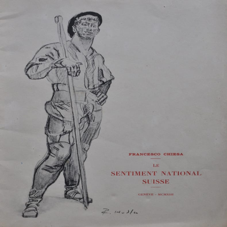 Genève, Genève1913 ; plaquette grand in-8, broché, couv. illustrée. 15 pages.ÉDITION ORIGINALE imprimée à Genève par Albert Kündig pour la librairie A. Eggimann. Couverture illustrée d’un dessin du peintre suisse Ferdinand HODLER.Discours prononcé au banquet offert à Francesco Chiesa à Genève le 9 mars 1913 par un groupe d’écrivains, d’artistes “afin de fortifier l’esprit suisse dans ce qu’il a de meilleur et de plus élevé, de proclamer l’intime et libre collaboration des trois Suisses à une œuvre supérieure et de rattacher plus étroitement l’âme tessinoire à la patrie commune en lui réservant une place d’honneur.” Le poète suisse de langue italienne Francesco Chiesa est né à Sagno (Tessin) en 1871 et mort à Lugano en 1973. Il s’est intéressé à l’identité culturelle du Tessin, seul canton entièrement italophone de la Suisse. Bel exemplaire de cette publication qui semble rare.