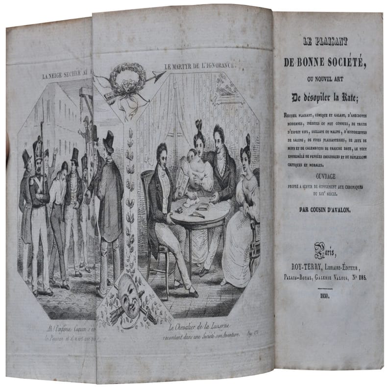 Paris, Roy-Terry, Paris, Roy-Terry1830 ; in-16, demi-veau brun, fil. dor. (Rel. vers 1860) 213 pp.Frontispice gravé dépliant avec 2 scènes illustrant des anecdotes du livre. ÉDITION ORIGINALE. Petite collection d’anecdotes prétendues comiques, par un maître de ce genre de productions que l’on trouvait dans les vitrines des libraires du Palais-Royal. Le compilateur Charles-Yves Cousin, né à Avallon en 1769 est allé chercher fortune à Paris en 1789. Travailleur infatigable, auteur d’une grande quantité de volumes (surtout des ana), il ne fit malheureusement pas fortune, loin de là. On lui doit plusieurs petits traités gourmands qu’il signait A. T. Raimbault, homme de bouche. Mais le destin est parfois injuste envers les bons vivants, car Cousin d’Avalon est mort de faim. Un soir d’hiver, vers 1840, on ramassa sur le parvis de Notre-Dame un vieillard expirant de froid et de faim. Il reçut trop tard le secours de la Société des Gens de Lettres et succomba quelques jours plus tard. A. P. F. Ménégault le gratifie d’une notice dès 1816 dans Le Martyrologue littéraire : “Trente volumes depuis quinze ans, on répandu sa gloire vers les quatre points cardinaux de l’univers lettré. Sans son génie calculateur, combien d’utiles ana n’auraient pas enrichi le comptoir des librairies et de la bibliothèque des gens de goût ! Et toi, trop heureuse ville d’Avallon, rivale de Tonnerre, dont le vin fait tant de bruit, soi fière d’avoir vu naître le grand Cousin ; conserve bien dans tes archives son extrait de baptême, pour que cet illustre avantage ne te soit pas disputé un jour par les communes de Beaune, d’Anières et de Montmartre.”Fente à un mors supérieur.