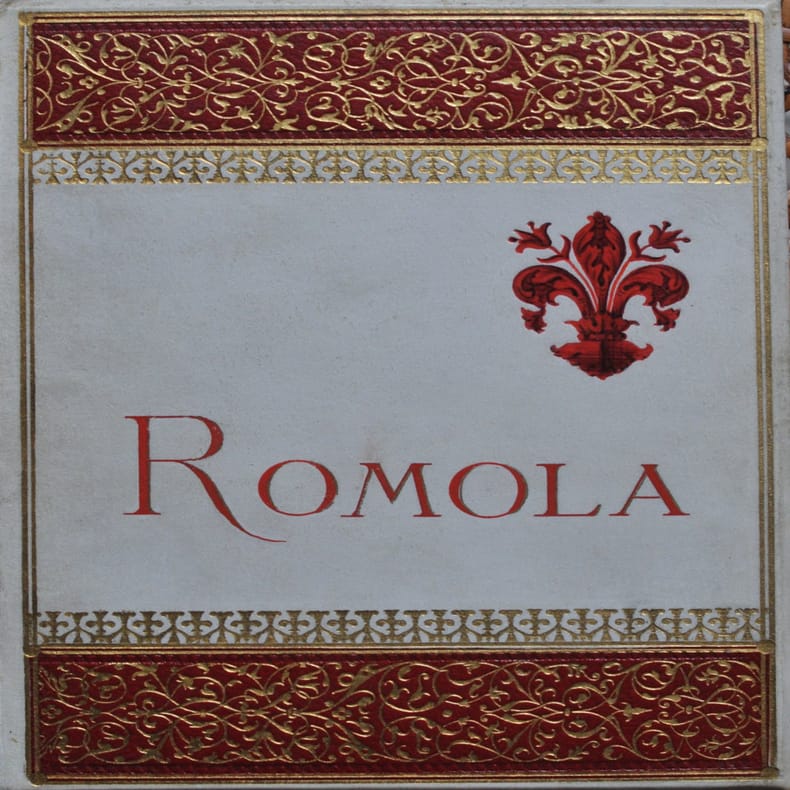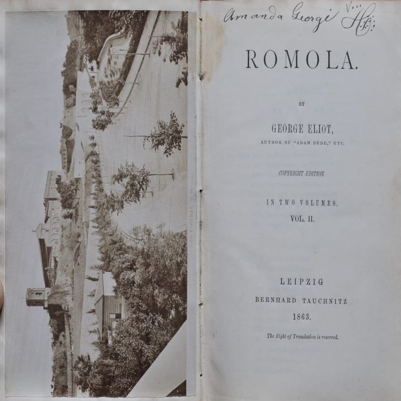 Leipzig, Bernhard Tauchnitz, Leipzig, Bernhard Tauchnitz1863 ; 2 vol. in-12, reliures d’éditeur en vélin ivoire, avec décor de bandes de maroquin rouge ornées d’arabesques dorées, dentelles dor., titre en rouge sur le plat, dos couverts d’arabesques dorées, pièces de titre en maroq. rouge, dentelle intér. dor., doublé et gardes de papier décoré, tranches rouges. Belle édition à la date de l’originale publiée à Londres en 3 volumes chez Smith, Elder and Co. Cette édition de Leipzig est illustrée de 29 PHOTOGRAPHIES ORIGINALES à pleine page montées hors-texte sur vélin fort. La romancière situe son récit à la fin du XVe siècle à Florence, la Florence de Savonarole. Ce roman historique est aussi une remarquable peinture de la vie artistique, religieuse et sociale de la ville à la Renaissance. Avant d’être publié en volumes, Romola avait paru en 14 livraisons dans le Cornhill Magazine de juillet 1862 à août 1863.Les photographies originales sont des vues de sites et monuments de Florence. Cette intéressante publication n’est pas signalée dans Goldschmidt et Naef dans The Truthful Lens qui décrit les livres illustrés par la photographie entre 1844 et 1914.