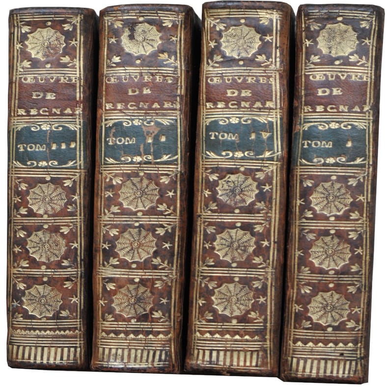 Paris, chez les Libraires Associés, Paris, chez les Libraires Associés1770 ; 4 volume petit in-12, veau fauve marbré, dos recouverts d’un beau décor doré, tranches rouges. (Reliure de l’époque) 4 ff., 335 pp. - 2 ff., 383 pp. - 2 ff., 381 pp. - 2 ff., 404 pp., 1 f. privilège.“Voici, sans contredit, l’édition la plus exacte qu’on ait donnée jusqu’à présent des œuvres de Regnard ; les connaisseurs s’en apercevront aisément à la première inspection (...) L’éditeur, M. Delaporte, après avoir examiné et comparé toutes les éditions anciennes et modernes avec les manuscrits restés au Dépôt de la Comédie, a fait les corrections et changements nécessaires et plusieurs gens de lettres ont veillé avec l’attention la plus scrupuleuse à l’exécution typographique...” Avis des libraires sur cette nouvelle édition de 1770.Le 1er tome contient les Voyages de Regnard de Flandres et de Hollande, de Laponie, de Pologne, d’Allemagne, de Normandie, de Chaumont ainsi que La Provençale (petit roman autobiographique posthume). Les 3 autres tomes contiennent les comédies et vers en prose, la tragédie Sapor, le ballet Le Carnaval de Venise et les Poésies diverses (épîtres, stances, sonnets, divertissements, chansons) et la Satyre contre les maris (réponse à celle de Boileau contre les femmes). Bel exemplaire. Ex-libris manuscrit d’un médecin du XVIIIe siècle Ex Libris Dupuis med.