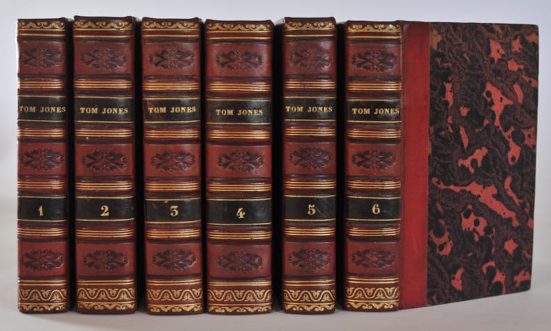 Paris, Dauthereau, Impr. Firmin Didot, Paris, Dauthereau, Impr. Firmin Didot1828 ; 6 volumes in-18, demi-veau rose, dos à nerfs, fil. et dent. dor., fleurons à froid, tr. marbr. 2 ff., IV pp., 283 pp. - 2 ff., 361 pp. - 2 ff., 338 pp. - 2 ff., 407 pp. - 2 ff., 324 pp. - 2 ff., 344 pp.“Le premier roman du monde et le livre le mieux fait de l’Angleterre” selon La Harpe, jugement confirmé par Somerset Maugham qui place Tom Jones parmi les dix plus grands romans dans son essai Dix romans et leurs auteurs. Publié à Londres en 1749, il sera adapté dès 1750 en français par Pierre-Antoine Laplace et retraduit ensuite par Davaux en 1795 puis par L. C. Chéron en 1804. Cette édition de 1828 est donné comme une traduction nouvelle. Dans l’Avant-propos du traducteur signé E. T., celui-ci parle de ses prédécesseurs “La Place qui a cruellement mutilé Tom Jones (...) Lavaux (pour Davaux) qui lui a fait parler un français rempli de négligences, Chéron, lourd et diffus dans son exactitude”. Nous n’avons pas su identifier ce nouveau traducteur. En tête du 1er tome on trouve (pp. 1. à 48) la Notice biographique et littéraire sur Henry Fielding par Walter Scott. Bel exemplaire, jolies reliures romantiques.