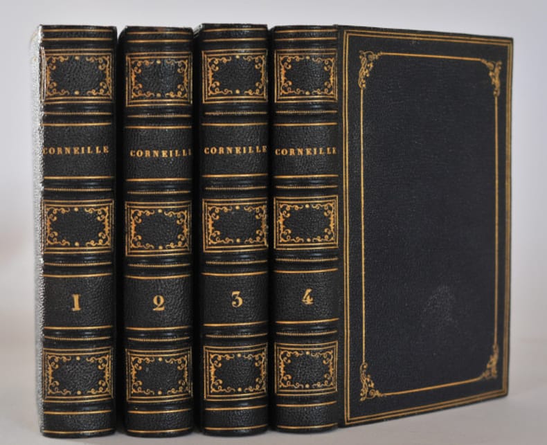 Paris, L. De Bure, Paris, L. De Bure1824 ; 4 vol. in-16, plein chagrin noir, double encadrement de filets dor. avec arabesques aux angles, dos avec fil. et caissons ornés dor., encadr. intér. fil. dor., fil. en pointillé sur les coupes, tranches dor. 2 ff., CLXXIII pp., 230 pp., 1 f. - 2 ff., 336 pp. - 2 ff., 330 pp., 1 f. - 2 ff., 333 pp., 1 f.Portrait gravé en frontispice. Belle typographie de Firmin Didot. En tête du 1er tome on trouve la Vie de P. Corneille par Fontenelle et les trois discours du Poème dramatique, de la tragédie, des trois unités. Très bel exemplaire finement relié offert en cadeau de nouvel an : “À mon jeune ami Eugène Saintpère, témoignage d’un sincère attachement, espérance d’une plus intime affection. Le 31 déc. 1854. E. Bertinelli”.