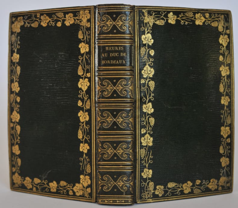 Paris, chez Lefuel, Paris, chez Lefuel1822 ; in-12, plein maroquin vert à longs grains, encadrement fil. et pampre de vigne, raisins dor., dos orné d’un décor de fil. et arabesques dor., guirlande intér. dor., tr. dor. 8 ff. n. ch. (titre, fx-titre, dédicace, permission, calendrier), XX pp., VIII pp., 344 pp.Titre gravé et 12 planches gravées hors-texte.Livre d’heures dédié à la duchesse de Berry en l’honneur du fils posthume du duc de Berry, né en septembre 1820, 7 mois après l’assassinat de son père par L. P. Louvel. Celui que Lamaratine appelait l’enfant du miracle partira en exil avec sa famille en 1830. Le légitimiste éditeur Lefuel adresse ce vœu à la duchesse de Berry dans l’épître dédicatoire : “(...) Le Fils de la France sera élevé par votre Altesse Royale dans les principes de son Auguste Père et de ses immortels aïeux. Daignera-t-elle permettre que j’orne du nom chéri du Duc de Bordeaux ces Heures chrétiennes...”Exemplaire dans une belle reliure romantique avec un surprenant décor, plus bachique que chrétien.