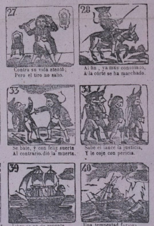 Madrid, Despacho, Madrid, Despacho1875 ; 31 x 44 cm., Image portant le n° 6 du catalogue de l’éditeur. 48 vignettes légendées de 2 lignes. Épreuve sur papier fin rose.