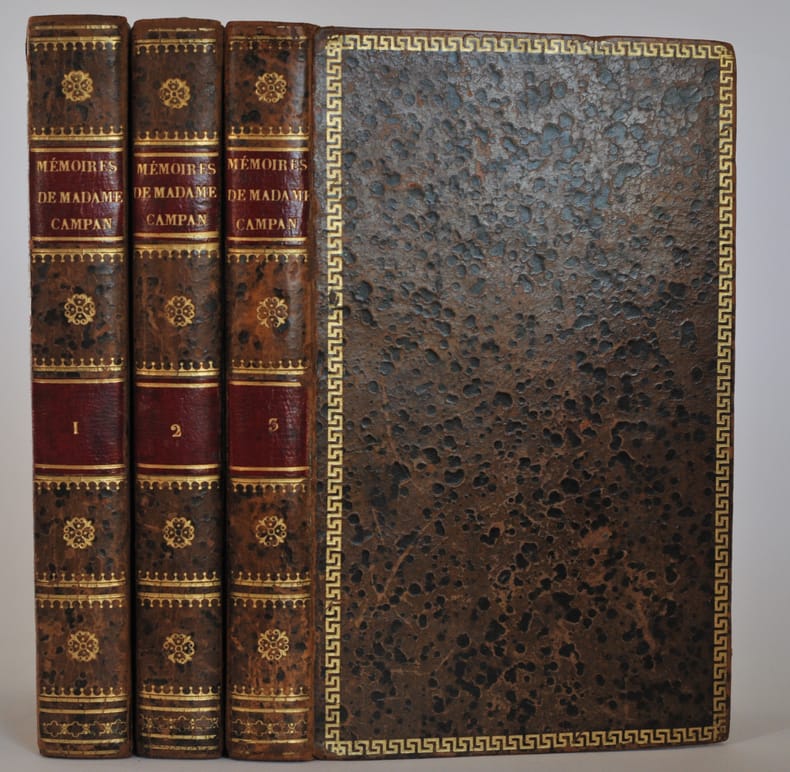 Paris, Baudouin, Paris, Baudouin1823 ; 3 volumes in-8, plein veau granit, encadrement grecques dor., dos ornés de frises et fleurons dorés, pièces de titre en maroq. rouge, tr. marbrées. 2 ff., XLVIII pp., 382 pp. - 2 ff., 399 pp. - 2 ff., 382 pp.Portrait de Mad. Campan gravé par Dien au 1er tome.L’édition originale a paru chez le même éditeur en 1822, peu après la mort de l’auteur. Ces mémoires appartiennent à la Collection des Mémoires relatifs à la Révolution française. La notice sur Madame Campan (48 pp. au début du tome 1) est signée F. Barrière. Exemplaire bien relié à l’époque, rousseurs éparses.