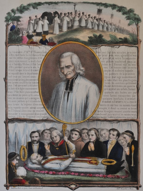 Jean-Marie Vianney (Dardilly 1786 - Ars-sur-Formans 1859) qui fut curé d’Ars pendant plus de 40 ans et menait une vie austère, était regardé comme un saint par ses paroissiens. Sa réputation s’étendit bien au-delà des Dombes et, dès 1830, Ars devint un lieu de pèlerinage très fréquenté, y compris par des étrangers. Mortifications, jeûne, cilice et flagellation, infestations diaboliques... miracles, guérisons et apparitions célestes... autant de pratiques qui justifient sans doute la béatification du curé en 1905 par Pie X, la canonisation en 1925 par Pie XI, la vénération de plusieurs papes du XXe siècle ainsi qu’un court métrage par Jacques Demy en 1959.1) Derniers moments de Mr. J. M. Vianey curé d’Ars. Grande lithographie montrant le curé à l’agonie entouré de l’évêque de Belley et de fidèles en prière et en pleurs (40 x 29 cm.) À l’adresse de Gadola, Cours de Brosses, Lyon et Gosselin, Paris. Légende sous l’image.2) J. M. B. Vianey curé d’Ars. Grande image lithographique aquarellée et gommée. Lith. Gosselin, Paris ; Gadola édit., Lyon. Portrait, lit de mort et cortège funèbre. Notice. (27 x 36 cm.)3) Portrait du curé d’Ars en prière. (21 x 31 cm.) signé Nap. Thomas. Lith. Laurent, Paris - Ganola édit., Lyon.4) Les Heures de Mr. J. M. B. Vianey, curé d’Ars. Lithographie par Laurent à Paris, éditée par Ganola, Lyon (19,5 x 27,5 cm.) Portrait entouré de 9 vignettes illustrant des scènes de la vie du curé.