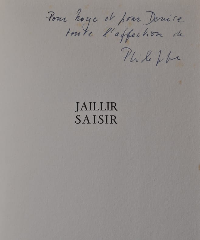 [Bruxelles], Le Cormier, [Bruxelles], Le Cormier1971 ; in-8, broché, couv. à rabats. 61 pp., 1 f.ÉDITION ORIGINALE éditée par Le Cormier pour le compte de la Maison Internationale de la Poésie, imprimée par J. Dieu-Brichart. - Frontispice de Raoul Ubac.Recueil poétique avec des révérences à Jacques Villon, Kurt Schwitters, Brancusi, Alechinsky, Hans Hartung, Henry Moore, Pol Bury, Rik Wouters, Matisse, Max Ernst, Jean Deyrolle, Raoul Ubac.Un des 235 exemplaires sur Featherweight (n° 131) avec un ENVOI AUTOGRAPHE au poète Norge “Pour Norge et pour Denise, toute l’affection de Philippe”. Philippe Robert-Jones (Ixelles 1924 - Uccle 2016) fut poète et historien de l’art et occupa d’importants postes à l’Université de Bruxelles et dans les musées des Beaux-Arts de Belgique.