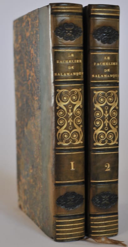 Paris, Genets jeune ; impr. Didot le jeune, Paris, Genets jeune ; impr. Didot le jeune1820 ; 2 vol. in-16, demi-veau olive, dos lisses ornés d’arabesques dorées et fleurons à froid, tranches marbr. 2 ff., 332 pp. - 2 ff., 330 pp.6 illustrations non signées gravées hors-texte. Le dernier roman de Lesage, roman picaresque et satirique pseudo-espagnol, comme Gil Blas de Santillane. Étiquette de librairie Ancelle 37 rue de l’École de Médecine.