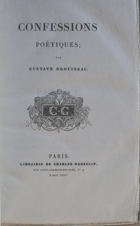 Paris, Gosselin, Paris, Gosselin1834 ; in-8, demi-maroquin noir, dos à nerfs, entièrement non rogné. 2 ff., 296 pp.ÉDITION ORIGINALE. Ce recueil de trois cycles de poèmes : Illusions, Lutte, Foi est le dernier livre publié par Gustave Drouineau, un écrivain qui fut célèbre et oublié peu après. Il est né à La Rochelle en 1798 dans une famille bourgeoise qui tenait une pension. Arrivé à Paris pour y poursuivre des études de droit, il abandonne rapidement. La littérature lui semblait plus attrayante que la jurisprudence. Sa carrière littéraire dura moins de dix ans. L’œuvre qui le rendit célèbre, Rienzi, une pièce de théâtre, date de 1826 et sa dernière publication paraît en 1834. En 1830 il prit une part active à la révolution de Juillet, en 1832 il manque de mourir lors de la grande épidémie de choléra. “Je n’appartiens ni ne veux appartenir à aucune école” disait-il lors de la bataille opposant classiques et romantiques. N’ayant pas choisi son camp, son théâtre fut étouffé par le nouveau courant. Il connaîtra de nouveau le succès avec Ernest ou les travers du siècle, un roman autobiographique dénonçant la férocité des milieux littéraires à l’égard d’un jeune provincial fraîchement arrivé à Paris. Ernest inspira Balzac pour les Illusions perdues. Le drame Rienzi est la source de l’opéra Rienzi de Wagner. Après la mort de sa femme, Drouineau s’oriente dans une nouvelle voie et produit quatre romans d’inspiration religieuse : Le Manuscrit vert, Résigné, Les Ombrages et L’Ironie. Il prône le néo-christianisme, une approche lyrique à la fois religieuse et sociale quelque peu teintée de saint-simonisme. Dans la préface de Mademoiselle Maupin, Théophile Gautier porte ce jugement : “Le christianisme est tellement en vogue par la tartuferie qui court que le néo-christianisme lui-même jouit d’une certaine faveur. On dit qu’il compte jusqu’à un adepte, y compris M. Drouineau”. En 1835 l’état de santé de Drouineau devient de plus en plus préoccupant. En décembre il est enfermé à l’asile des fous de Lafond près de La Rochelle. Il y passera le reste de sa vie, soit plus de 40 années, avant de mourir en 1878. Dans journaux avaient annoncé sa mort dès 1835, une fausse nouvelle qui fit écrire à Flaubert (dans une lettre à Ernest Chevalier de juin 1835) : “Gustave Drouineau est décidément mort, c’est un fleuron de gloire littéraire enlevé à notre couronne de rédaction”.Dans la préfaces des Confessions poétiques, Drouineau déclare : “Ce ne sont point les événements d’une vie obscure que je retrace ici, ce serait, de la part d’un homme jeune encore, une impudeur d’amour-propre condamnable : j’ai voulu peindre seulement le travail intérieur de la pensée, son éveil, ses illusions, ses incertitudes, ses désespoirs, ses luttes, ses croyances....”Bel exemplaire très frais, relié à toutes marges.
