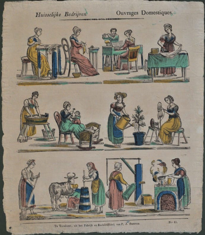 Turnhout, Brepols, Turnhout, Brepols(vers 1800) ; estampe de 40 x 34 cm., Suite de 6 bois non encadrés, coloriés en jaune, rose, bleu et vert, chaque bois portant 2 sujets sur le thème des taches domestiques de la femme : repassage, tricot, lessive, puériculture, filage, jardinage, cuisine, piano, barattage, etc. “Le prototype de l’image ne nous est pas connu. Une réplique lithographique a paru vers 1830 chez Arnz et Cie à Dusseldorf (...)” dit Van Heurck p. 175-76. Exemplaire de la première période avec l’adresse de Brepols. Tirage sur vergé, bel exemplaire frais.