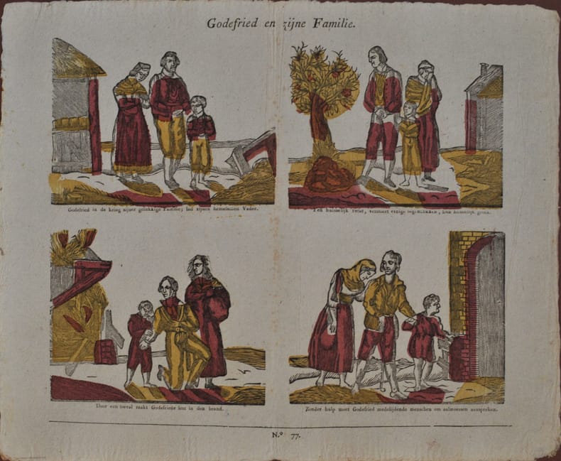 [Turnhout, Brepols], [Turnhout, Brepols]34 x 42 cm., Feuille oblongue portant 4 bois coloriés en rouge et jaune. Elle raconte l’histoire d’une famille de modestes paysans réduits à la mendicité par l’incendie de leur maison. Exemplaire du premier état décrit par Van Heurck p. 184 sans adresse et sans les filets d’encadrement en haut et sur les côtés. Bel exemplaire frais, tirage sur papier vergé.