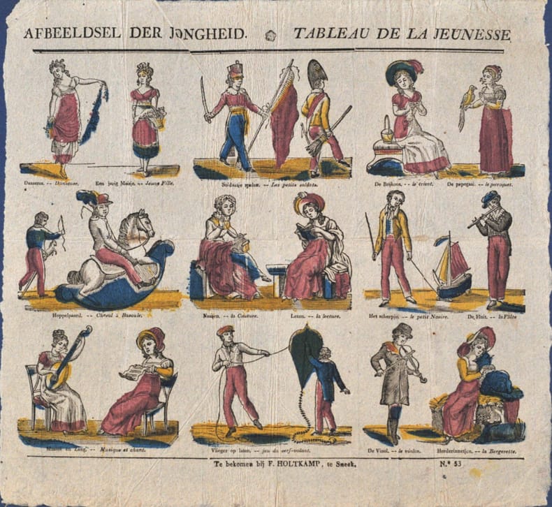 Sneek, Holtkamp, Sneek, Holtkamp(v. 1830) ; 39,5 x 34 cm., Feuille oblongue de 9 bois coloriés en rose, bleu et jaune. Légendes en flamand et français. Danse, petit soldat, tricot, cheval à bascule, cerf-volant, etc. Cette image porte le n° 53 du catalogue Brepols. “L’image a été gravée d’après un modèle français ou allemand, du temps de la Restauration. Les jeunes filles de notre image sont représentées dans une planche avec quatorze sujets, gravées vers 1820 pour la maison J. de Lange de Deventer (...) Une réplique de cette gracieuse image de Brepols a paru chez un éditeur hollandais inconnu.” dit Van Heurck p. 164. Tirage sur vergé du 1er état, à l’adresse de Holtkamp à Sneek, avec le même numéro d’ordre 53 que chez Brepols.