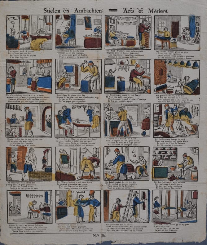 [Turnhout, Brepols], [Turnhout, Brepols]34 x 40 cm., Vingt bois encadrés, légendes en flamand et français, coloris vert, jaune et rouge. N° 36 du catalogue Brepols au bas de la page. Exemplaire du premier état, tirage sur vergé, sans adresse avec titre hollandifié (Stijlen au lieu de Stielen).