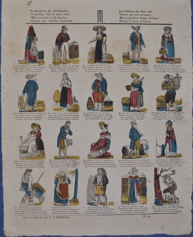 Turnhout, Brepols, Turnhout, Brepols33 x 43 cm., N° 59 du catalogue Brepols. Vingt bois non encadrés de costumes régionaux, coloriés en rouge, bleu et ocre. Distiques en flamand et français. Exemplaire de la première période à l’adresse “Uyt het Fabriek van P. J. Brepols” avec le remplacement dans le titre français (”leur situation” pour “sa situation”) tel que décrit par Van Heurck p. 172. Tirage sur vergé, bel exemplaire.