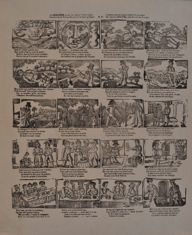 Turnhout, Glenisson, Turnhout, Glenisson33 x 40 cm., Vingt bois encadrés sur les voyages de Guliver. Distiques en flamand et français. “Copie modernisée exécutée vers 1830/35, d’après une image de Brepols (n° 17, 1er type). Les tableaux sont à rebours. Provient sans doute du fonds ancien de Delhuvenne.” dit Van Heurck p. 380. Exemplaire en noir, sans adresse.