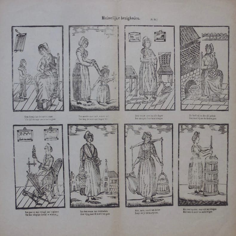 [Rotterdam, Thompson], [Rotterdam, Thompson]feuille de 40 x 32 cm., 8 bois encadrés de 8,5 x 11 cm. en noir montrant les taches ménagères : puériculture, ménage, cuisine, filage, barattage, etc. Image non signée portant le n° d’ordre 54, De Meyer De volks- en Kinderprent in de Nederlanden p. 318 lui attribue le n° 154.