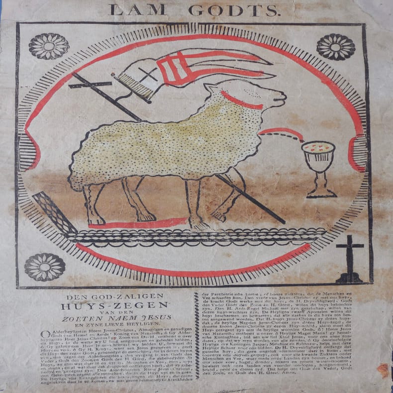 [Venlo, Bontamps], [Venlo, Bontamps]vers 1775 ; feuille de 28 x 38,5 cm., Rare image connue uniquement par cet exemplaire qui est reproduit hors-texte p. 8 de Van Heurck et Boekenoogen, c’est également cet exemplaire provenant de la coll. Norge qui est cité dans De Meyer p. 80. Le bois est dans un encadrement de filets de 25 x 24 cm., il montre l’agneau portant la croix ornée d’un phylactère, le sang de son sacrifice jaillit dans un ciboire. La scène est dans un cercle rayonnant et 3 fleurons et crucifix aux angles, coloris en jaune et rouge. Sous le bois, texte en flamand sur 2 colonnes. Tache rousse au centre de l’estampe, petits accidents et taches dans les marges.