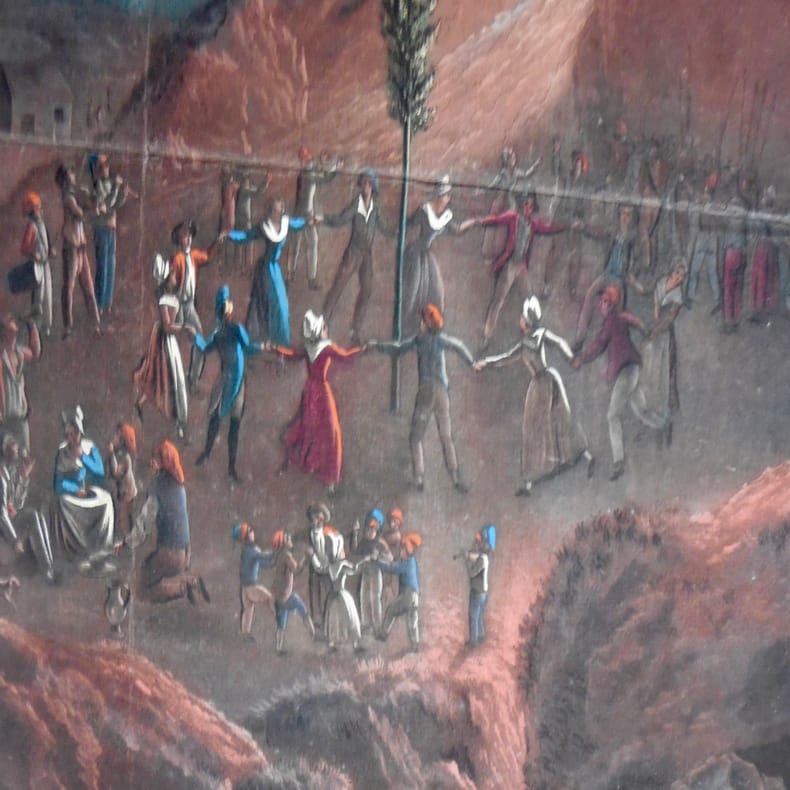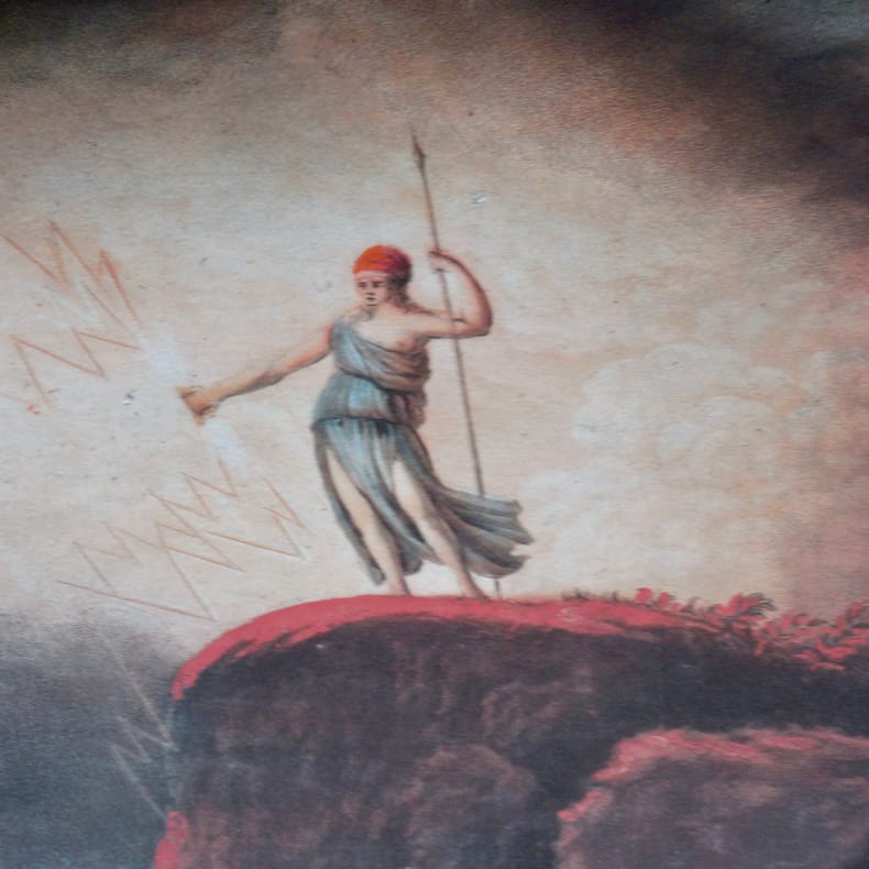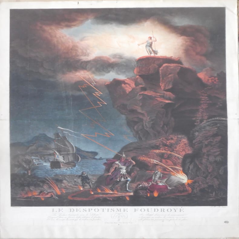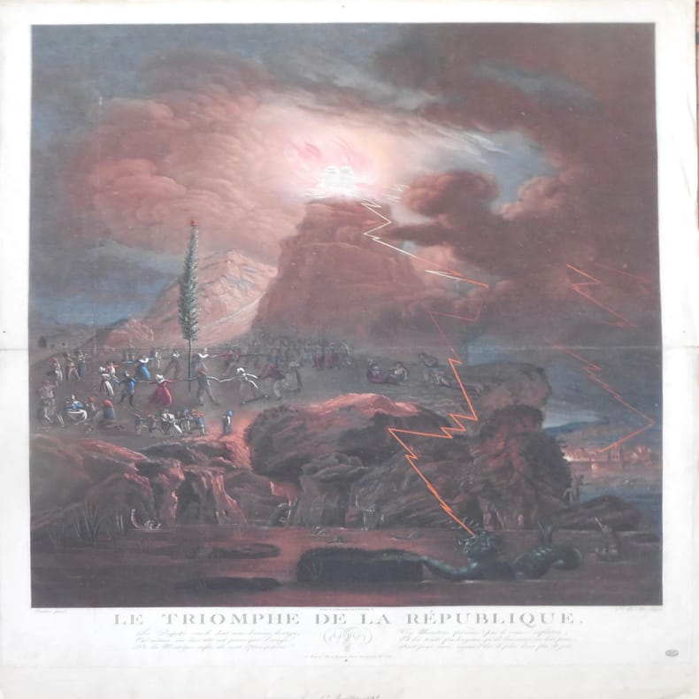 Paris, Bance, Paris, Bance(1794) ; 80 x 56 cm. (chaque feuille), Rarissime paire d’estampes révolutionnaires gravées par Pierre-Michel Alix d’après Jean-Jacques Boissieu (orthographié Boissier sur l’une, Boissieux sur l’autre). Plaques de 54 x 75 cm. portant des illustrations de 49,5 x 65 cm. Sous les sujets figure un texte gravé : titre, texte, adresse et signatures.- Le Triomphe de la République accompagné de l’explication de l’allégorie : les despotes cruels dont nous bravons la rage, eux mêmes, sur leur tête ont provoqué l'orage. De la montagne enfin ils son précipités ces monstres furieux par le crime enfantés ; et les traits foudroyans qu'ils lançoient sur leur proie, sont pour nous, aujourd'hui le plus beau feu de joie. L’image montre les Droits de l’Homme représentés comme les tables de la Loi, au sommet d’une montagne d’où jaillissent des éclairs, au pied de la montagne les citoyens dansent autour d’un arbre de la Liberté. En bas de l’image, plusieurs personnages dont un prêtre sombrent dans un marécage peuplé d’un monstre marin frappé par la foudre, au second plan un château en flammes lui aussi frappée par la foudre des droits de l’Homme. Elle est datés du 9 Thermidor an II (27 juillet 1794), un état que le Fonds Français I p. 91 ne connaît que la description Coll. de l’Hist. de France - Coll. De Vinck, 5012. Dans cette estampe, “le graveur alla jusqu’au paroxysme du goût révolutionnaire et des procédés d’enluminure... C’est le plus effroyable gachis de cinabre qu’on puisse produire” dit Renouvier, L’Art pendant la Révolution p. 252 cité par Fonds Français op. cit. - Le Despotisme foudroyé. Du haut d’une montagne, une femme coiffée du bonnet rouge, drapée à l’antique tient une pique d’une main et la foudre de l’autre. Elle apparaît dans un halo de lumière qui traverse d’épais nuages. Elle foudroie le despotisme représenté par des personnages couronnés dont un roi qui se débat dans les marécages et un évêque qui tient les clés de S. Pierre. Au second plan la mer avec un bateau pavoisant le drapeau tricolore qui s’éloigne de la tempête. Le texte explicatif dit “La Justice triomphe avec la Liberté, l’Orgueil dans sa fureur laisse échapper la foudre, et sous les coups du sort qui le réduit en poudre, du Peuple il reconnaît la souveraineté ainsi par sa valeur, de victoire en victoire, la France est parvenue au faite de la gloire”. “À notre connaissance, cette pièce, qui d’ailleurs est loin d’être un chef d’oeuvre, n’est mentionnée dans aucun répertoire” dit Fonds Français I p. 92 qui ne cite que l’exemplaire décrit dans Coll. de l’Hist. de France.La la posture et les attributs de la République triomphant du despotisme rappelle beaucoup la statue que fera Dalou en 1889 (place de la Nation) intitulée Le Triomphe de la République, représentation qui comme ici surmontait des monstres marins (aujourd’hui disparus). Marges anciennement doublées, pliures avec fentes sans manque, timbres humides dans les marges sur les 2 gravures.