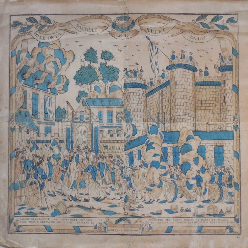 Orléans, Letourmy, Orléans, Letourmyv. 1790 ; 66 x 84 cm., Grande composition formée de 4 planches coloriées en bleu, rose et jaune. Encadrement de filets et d’un décor avec rameaux d’olivier, couronnes de laurier, ruban, faisceaux, cors, coeurs enflammés ailés. La bastille gardée par les soldats royaux, au premier plan arrestation du gouverneur et combats avec canons, barils, boulets, soldats armés. Au second plan des maisons en flammes. Sous le sujet, texte sur 2 lignes “Assaut de la Bastille fait le 14 juillet 1789 sous la conduite des sieurs Hullin et Harné et Roland tous braves grenadié qui se sont emparré du gouverneur lont conduit a la Grève ou il a été décollé [sic]” ainsi que l’adresse dans un cartouche. Le titre est dans un phylactère en haut de la planche. Letourmy a produit une autre planche sur le même sujet titrée Prise de la Bastille récit mémorable... dont la composition et le format sont totalement différents (v. A. Martin n° 83). Cette planche semble inconnue de tous les catalogues de bibliothèques privées ou publiques et des bibliographies : pas chez BNF - A. Martin, L’Imagerie Orléanaise, BHVP, Carnavalet, etc. Tirage sur vergé, petits accidents doublés dans les marges et à une pliure, timbre humide dans une marge.