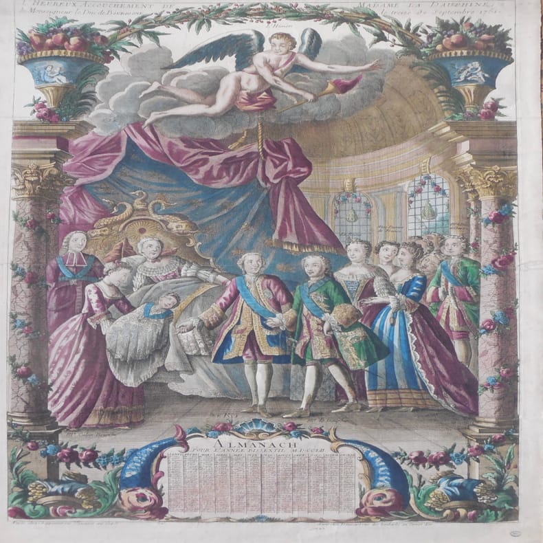 Paris, Charpentier et Tremizard, Paris, Charpentier et Tremizard1751 ; feuille de 57 x 78 cm., Grande estampe célébrant la naissance du duc de Bourgogne, Louis de France (1751-1761) le fils aîné du dauphin Louis et de Marie-Josèphe de Saxe, frère aîné de Louis XVI, Louis XVIII et de Charles X. Plaque de 51 x 71 cm., le sujet est encadré de filets et d’un décor architectural avec guirlandes de fleurs, fruits, etc. L’image montre la dauphine alitée dans une chambre à Versailles tandis que la nourrice (Mme Calier) présente l’enfant au roi, au dauphin, à la reine, à mesdames de France et au duc de Chartres. L’image est surmontée d’un ange portant une torche symbolisant l’hymen avec le titre “L’heureux accouchement de Madame la Dauphine de Monseigneur le Duc de Bourgogne le treize septembre 1751”, au bas de l’image figure un calendrier pour l’année 1752 encadré de dauphins rocailles et fleurs. L’estampe en taille-douce est coloriée en bleu, vert, rouge et jaune. 2 adresse gravées au bas de la plaque Paris chez Charpentier rue St Jacques au Coq et Paris chez Tremizard rue des Lombards au Cornet d’or. Étienne Charpentier, un imagier lié aux Chéreau était “éditeur d’estampes demi-fines, d’almanachs, etc., établi (...) rue Saint Jacques paroisse de S. Séverin au Coq. où il est signalé à partir de 1739.” dit Préaud et al. Dict. des éditeurs d’estampes à Paris sous l’Ancien Régime p. 75-76 qui ne connaît pas de Tremizard. On connaît plusieurs représentations peintes ou gravées de cet événement, notamment d’après Humblot, celle-ci semble inconnue, absente des collections publiques et privées. Petits accidents dans les marges, timbre humide dans une marge.