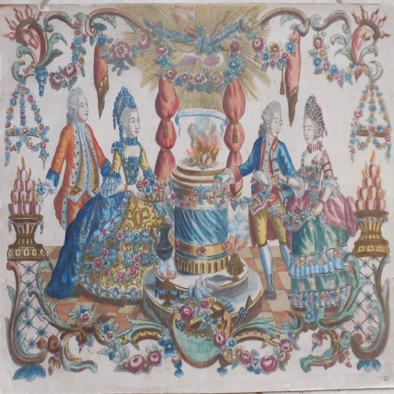 Paris, Mondhare, Paris, Mondharevers 1780 ; feuille de 54 x 75 cm., Grande planche en taille-douce encadrée de rocailles, fleurs, vases etc. au centre de l’image une colonne supporte un feu de coeurs enflammés surmonté de la devise “Il faut s’aimer”. De part et d’autre du feu, 2 couples en riches tenues. Coloris en bleu, vert, rouge et jaune. Tirage sur vergé doublé de papier fort, petits accidents dans les marges, timbre humide.