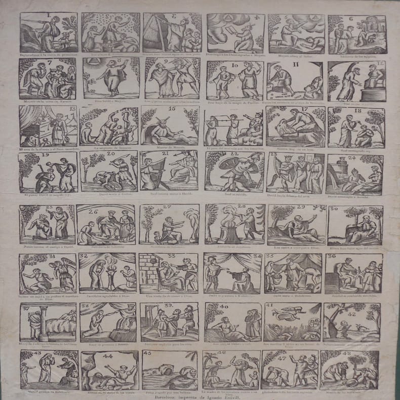 Barcelona, I. Estivill [i Cabot], Barcelona, I. Estivill [i Cabot] Suite de 48 vignettes racontant l’Ancien Testament, numérotées et légendées. Tirage sur papier à la cuve, cette planche existe aussi sur papier mécanique. Auques n° 73