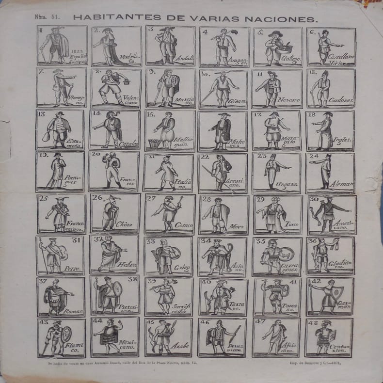 Barcelona, A. Bosch, imp. de Ramirez y C., Barcelona, A. Bosch, imp. de Ramirez y C.1871 ; 32 x 44 cm., Suite de personnages en costume des différentes régions d’Espagne et pays du Monde.