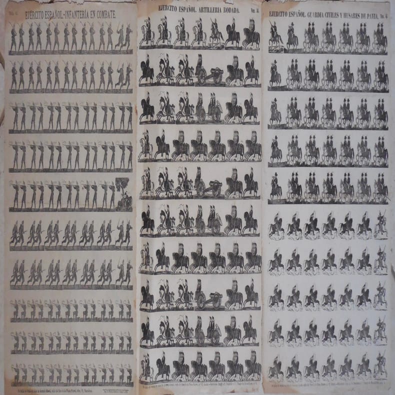 Barcelone, Antonio Bosch, imp. Ramirez, Barcelone, Antonio Bosch, imp. Ramirez1872 l’autre sd. vers la même date ; 32 x 44 cm., 3 planches de soldats : “Infanteria en Combate” montre des fantassins, “Guardia Civiles y Husares de Pavia” des cavaliers et “Arilleria Rodada” véhicules et pièces d’artillerie tirés par des chevaux.