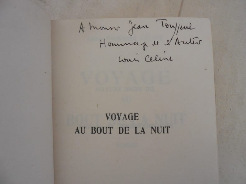 Paris, Denoël et Steele, Paris, Denoël et Steele1932 ; in-12, plein maroquin noir janséniste doublé de box beige, gardes de soie brochée beige, dos à 5 nerfs, tête dorée, tranches dorées sur témoins, chemise en demi-maroquin noir à bandes, étui bordé, couverture et dos 623 pp., 1 p. (adresse de l’imprimeur)ÉDITION ORIGINALE. Exemplaire hors commerce sur alfa. Cette première édition a été tirée à 10 exemplaires sur vergé d’Arches et 100 exemplaires numérotés sur alfa ainsi que quelques exemplaires hors commerce sur alfa réservés à l’auteur.ENVOI AUTOGRAPHE de l’auteur au romancier belge Jean TOUSSEUL, nom de plume d’Olivier Degée (Landenne 1890 - Seilles 1944). Jean Tousseul s’est toujours tenu à l’écart du monde littéraire. Contrairement à Céline, durant la guerre, il refusera toute collaboration avec le pouvoir issu de l’occupation allemande de la Belgique. Très affecté par la guerre, atteint de tuberculose, il a vécu ses dernières années dans un moulin à Seilles près d’Andenne dans la province de Namur. Seilles a été surnommé “le village gris” par J. Tousseul en raison de la couleur donnée aux toits de la localité par les poussières des carrières de calcaire de la région. Superbe exemplaire relié par Hélène Alix.