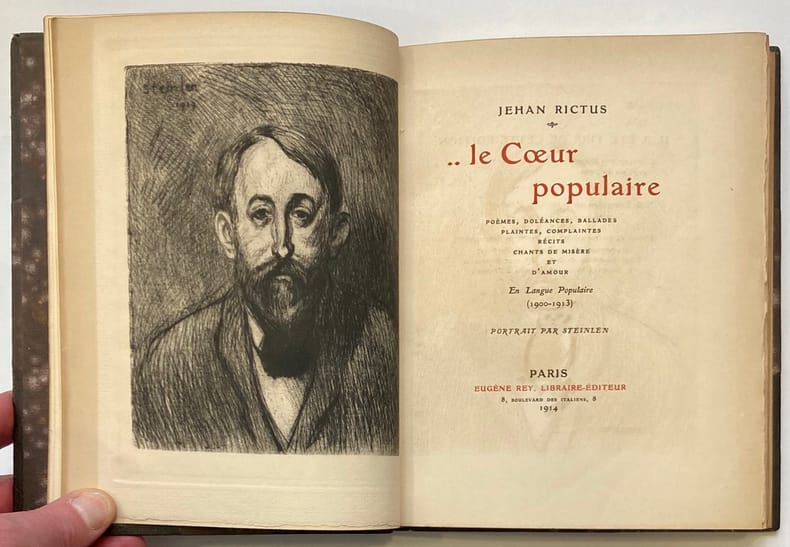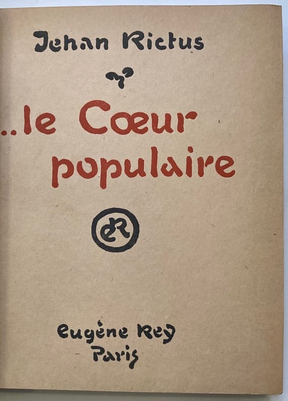 Paris, Eugène Rey, 1914. In-8 broché couv. rempliée, 223 p. + 8 p. sur papier rose "La Presse, la Critique et Jehan Rictus". Bon état : rousseurs sur couv. Edition originale.
