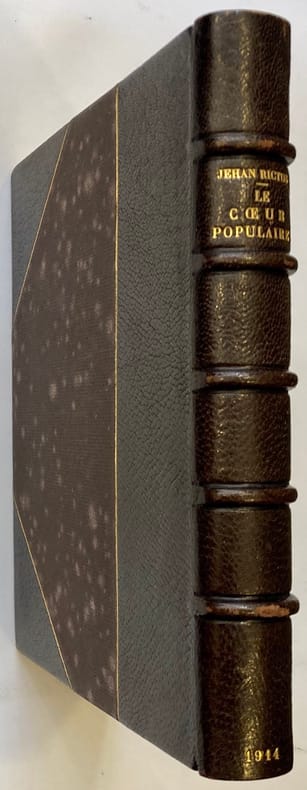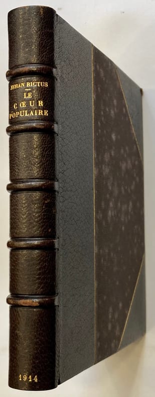 Paris, Eugene Rey, 1914 15.2x20.6 cm., 224 pp., edition avec un portrait de Jehan Rictus par Steinlen en n/b et 3 fac-similes de lettres d' Albert Samain et de Stephane Mallarme adressees a l'auteur, relie demi-maroquin brun a coins, signee par Laurent Peeters - Anvers. Filet dore cernant les plats de pap., dos orne, dos a 4 nerfs et finnement fleuronnes dores (decor floral), tete doree, couverture imprimee d'editeur. Tirage limite. Tirage de 1000 exemplaires sur papier velin d'Arches numerotes de 126 a 1125.