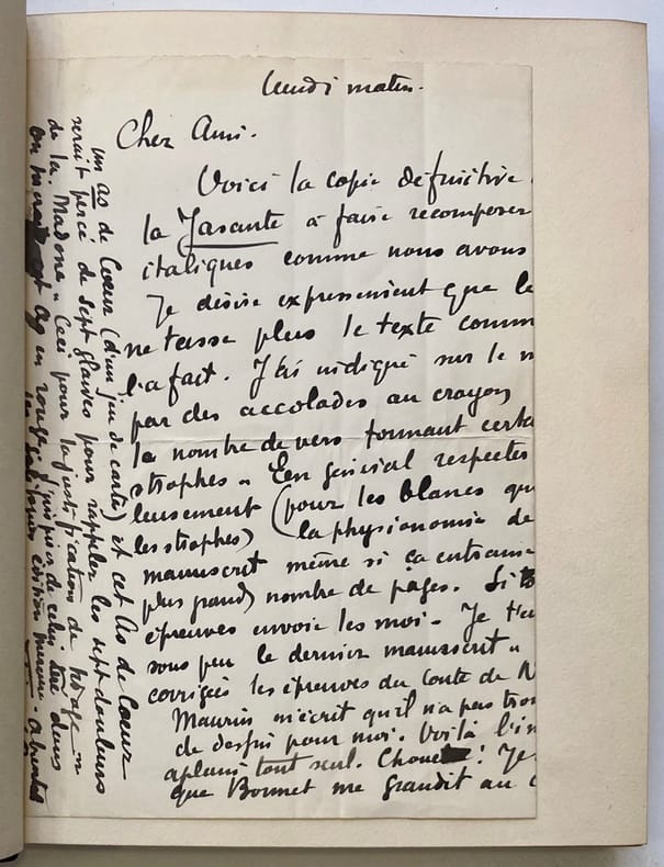 Edition originale, illustrée d’un portrait de l’auteur hors texte par Steinlen et comprenant 3 fac-similés de lettres d’Albert Samain et de Stéphane Mallarmé adressées à l’auteur. Tirage total à 1125 exemplaires. 1 des exemplaires numérotés sur vélin d’Arches. Exemplaire non coupé, enrichi d’une lettre de l’auteur signée de ses initiales (1 page in-8, pliée et renforcée au dos), non datée, s’adressant à son éditeur à propos de la composition de La Jasante de la Vieille. Il y donne des indications très précises sur l’emploi des italiques, invite à ce qu’on ne « tasse » pas le texte. Il fait mention du peintre-graveur Charles Maurin. Il indique renvoyer avec sa lettre les épreuves corrigées du Conte de Noël.
